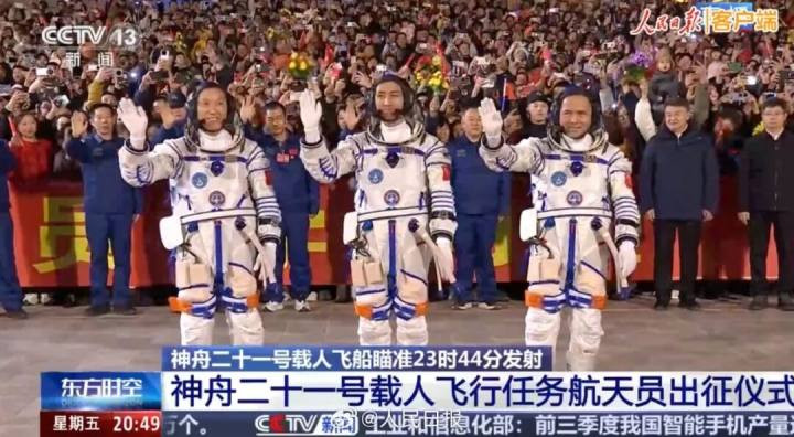 激动的心情驱散了戈壁深秋夜晚的寒意,在酒泉卫星发射中心问天阁前的圆梦园广场,航天科技工作者和群众汇聚,共同欢送神舟二十一号航天员乘组出征。10月31日20时48分,神舟二十一号航天员乘组张陆、武飞、张洪章身着白色航天服,稳步走出问天阁。